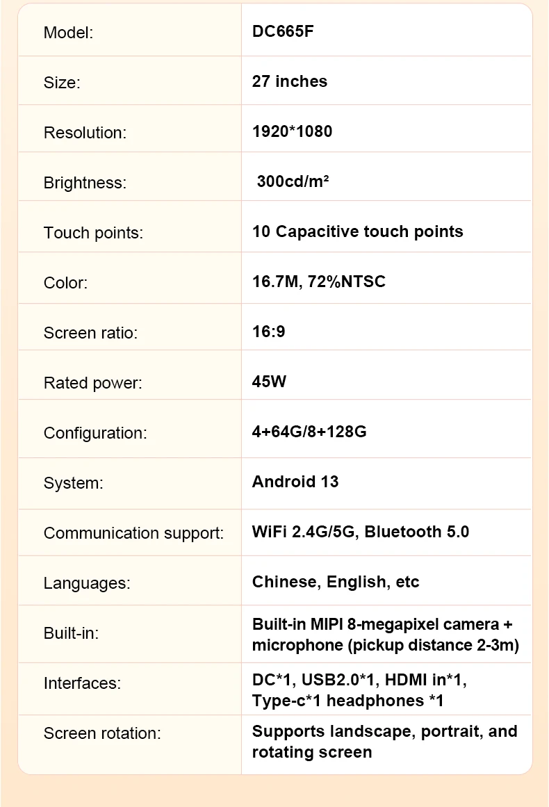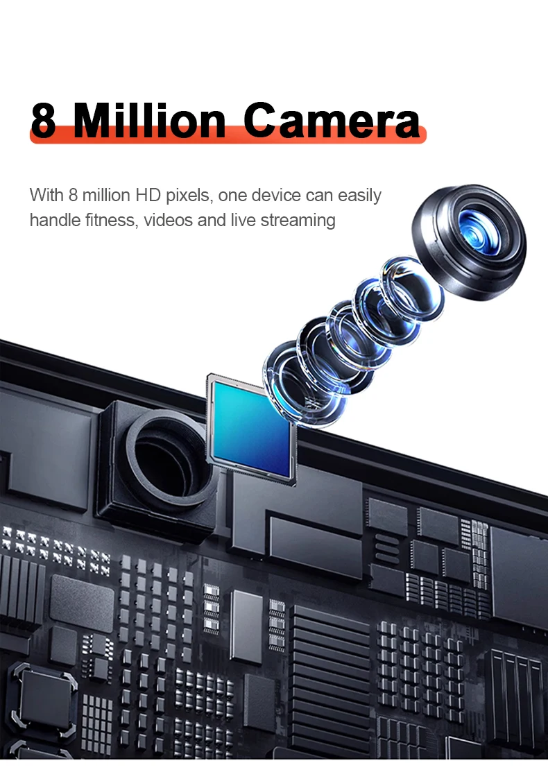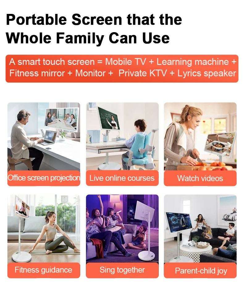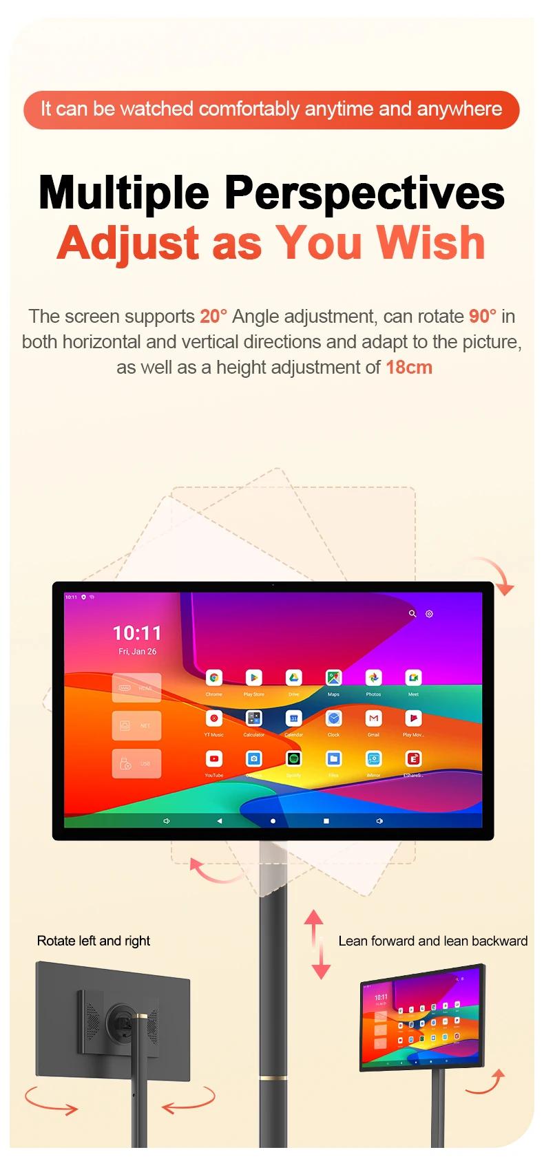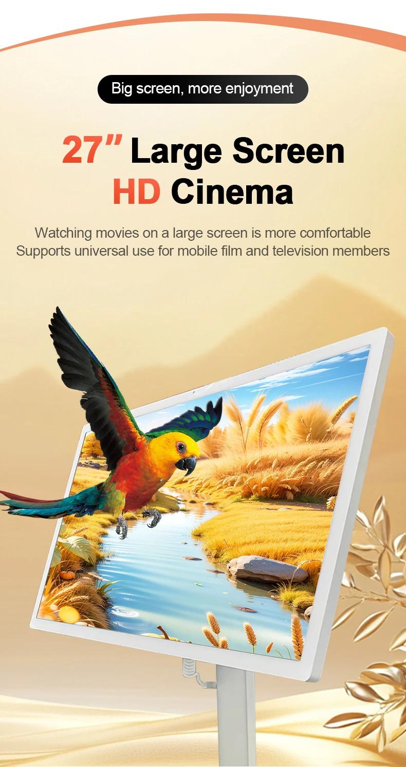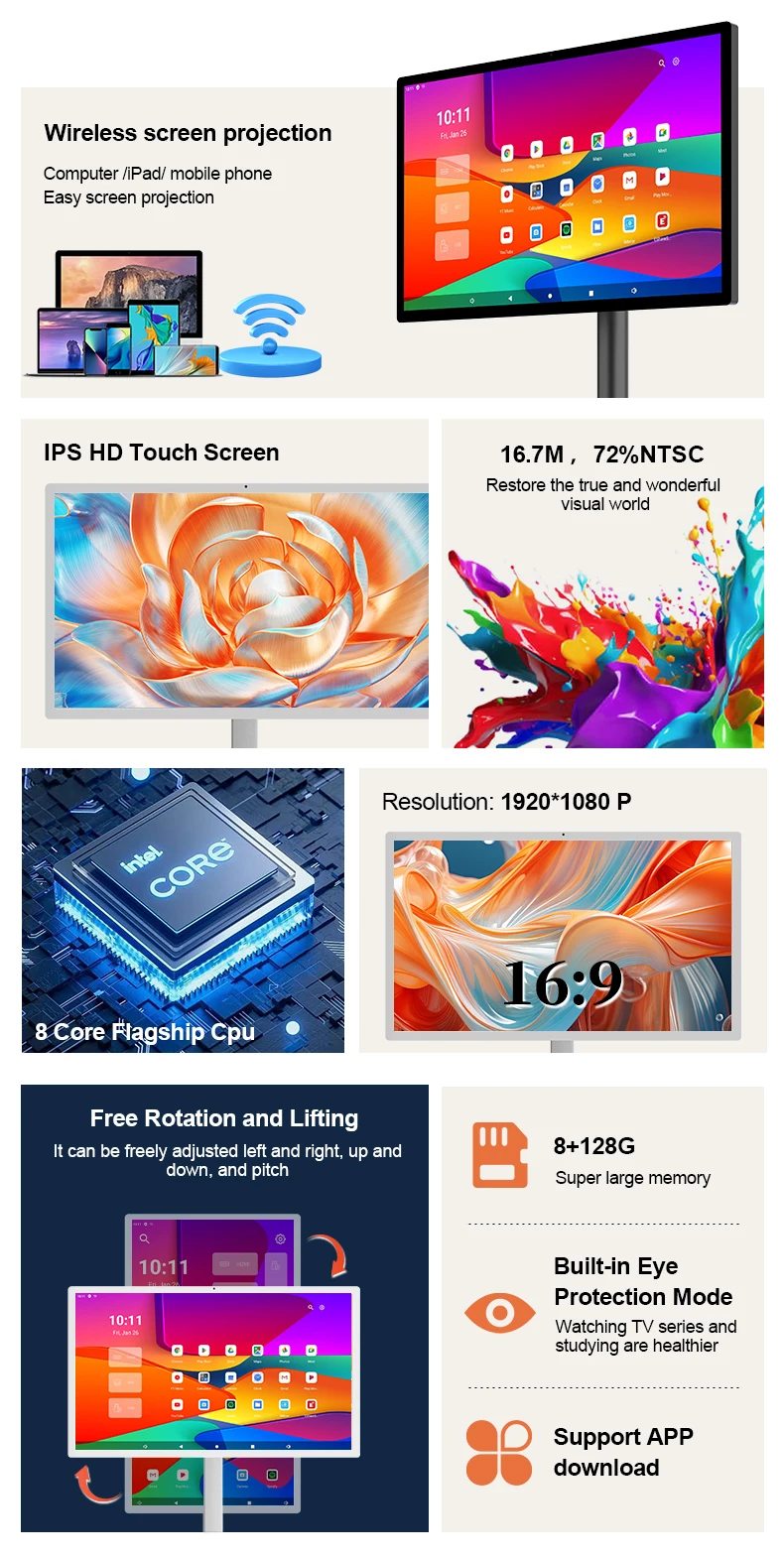 This product can achieve functions such as binge watching, listening to music, online classes, office work, and voice interaction. The screen can be freely switched between landscape and portrait. The elevation angle and depression angle can be adjusted by 20 degrees, and the left and right can be adjusted by 30 degrees. The height can be freely raised and lowered, and the base is equipped with a light tone universal wheel for convenience and flexibility. It also has a built-in 5 million camera. The software is equipped with an electronic whiteboard and screen projection software. One HDMI input can be used as a mobile display.
