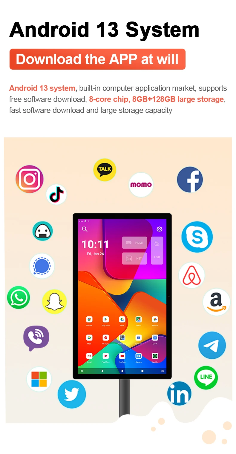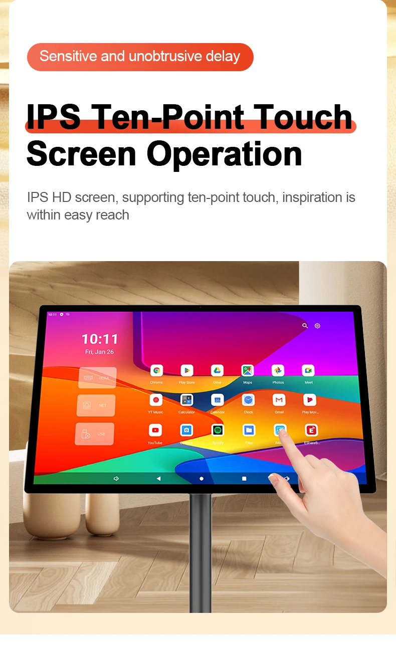 The base and bracket of this product are made of all aluminum alloy material, and the surface is treated with apple grade anodizing technology. The product has a bright color and delicate touch. The LCD screen body back shell is fully molded with plastic, and the ultra-thin full bonding assembly process is used. The humanized and beautiful design makes the picture look more three-dimensional. The bracket and screen body adopt a snap on quick release structure, with a reasonable layout, convenient and practical, and high-end quality. Built in massive applications for casual entertainment.