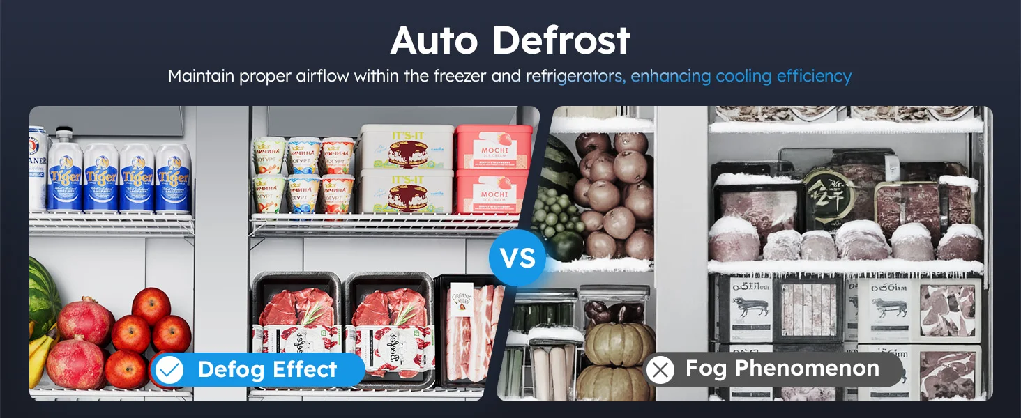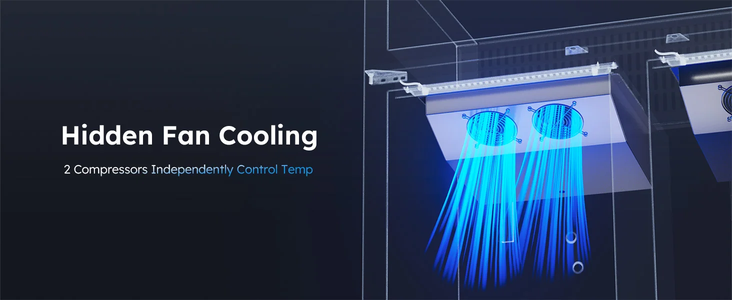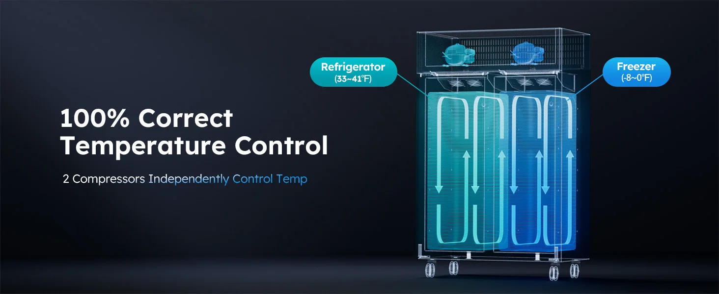 Equipped with two independent compressors and true air cooling technology, this unit ensures accurate temperature control with minimal fluctuation (±1°F), preventing cross-interference between fridge and freezer zones for optimal food preservation. -