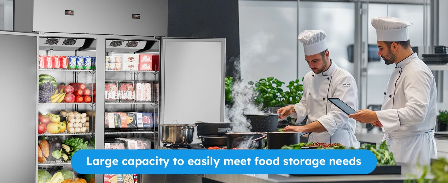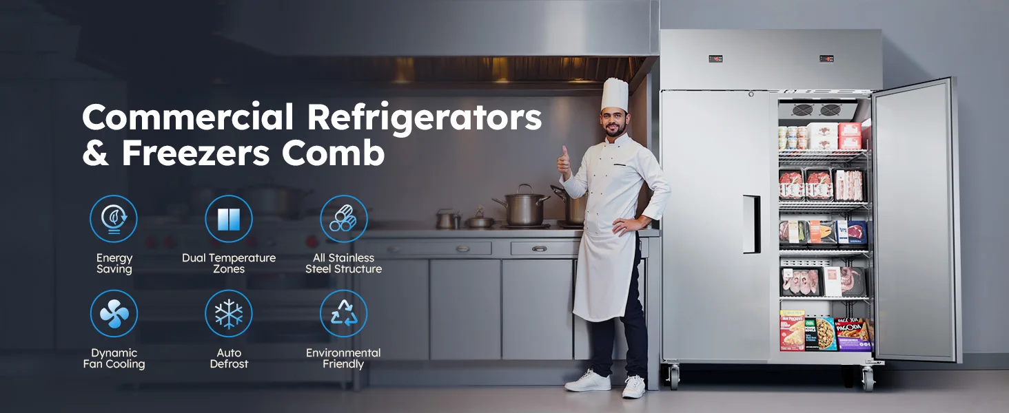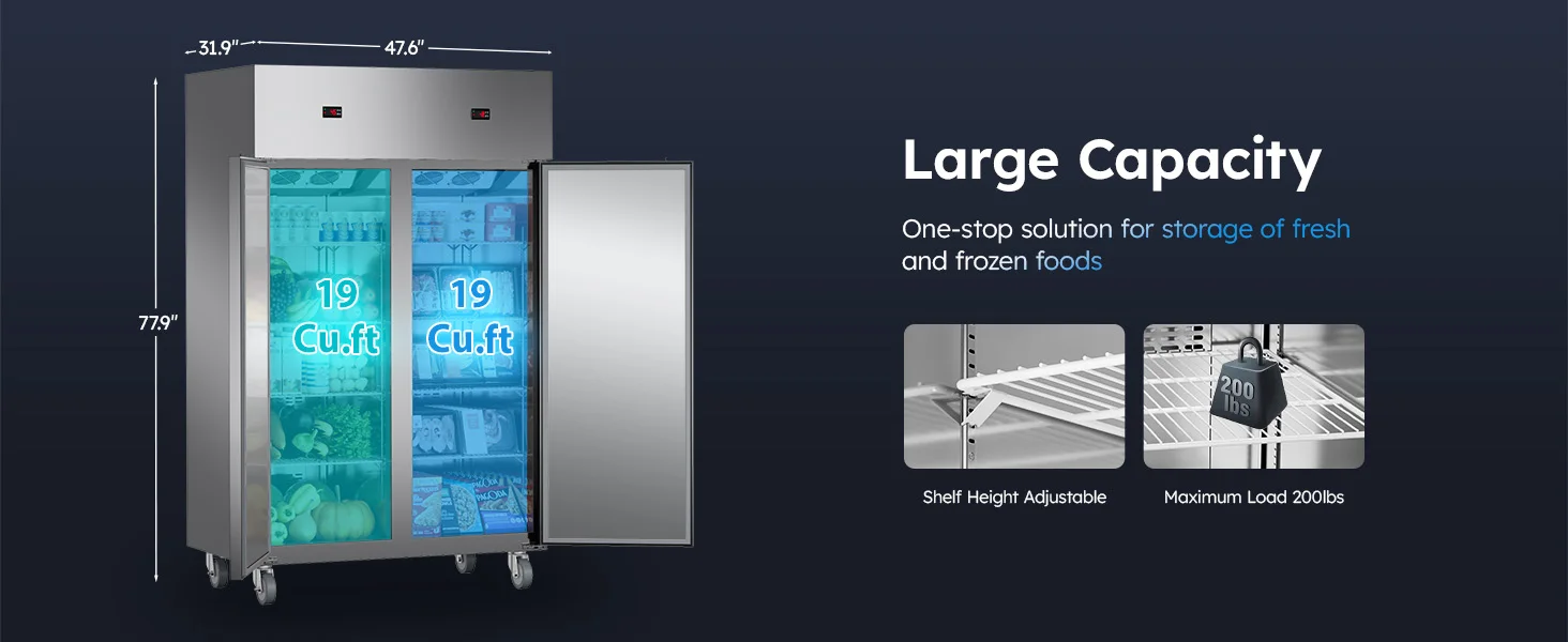 This 48″ W all-stainless steel Commercial Refrigerator Freezer Combo delivers professional-grade performance with 36 cu.ft capacity and dual independent temperature zones (refrigerator: 33~41°F; freezer: -8~0°F). Designed for durability and efficiency, it features a pure copper compressor with R290 refrigerant, 100% true air cooling, and automatic defrost. With 8 adjustable shelves (200 lbs capacity each), reversible doors, built-in LED lighting, and lockable wheels, this Industrial Fridge and Freezer Combo is ideal for restaurants, hotels, and commercial kitchens.
