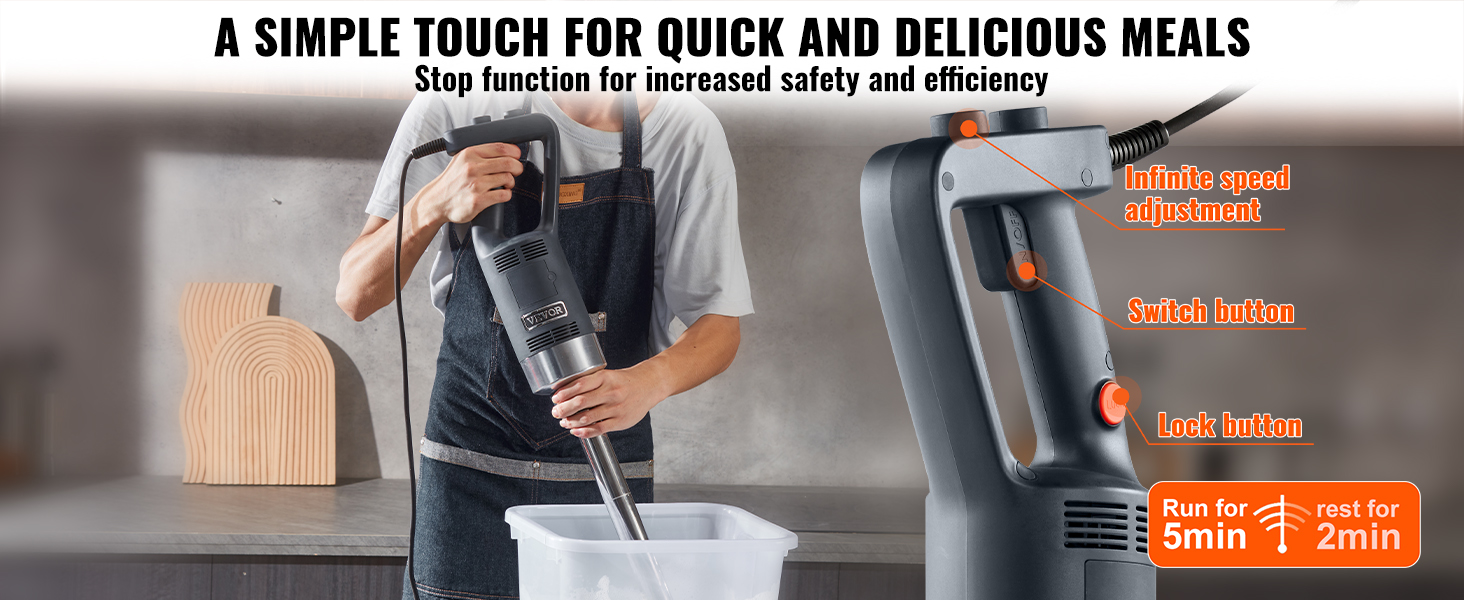 - One-Button Ease of Blending: Our stick blender features a rubberized comfortable grip, ensuring safe and controlled operation. The lock button design allows for prolonged use. Overheating protection ensures the machine cools down after continuous use—operate for 5 minutes and rest for 2, ensuring safety. Variable speed control provides a liberating blending experience.