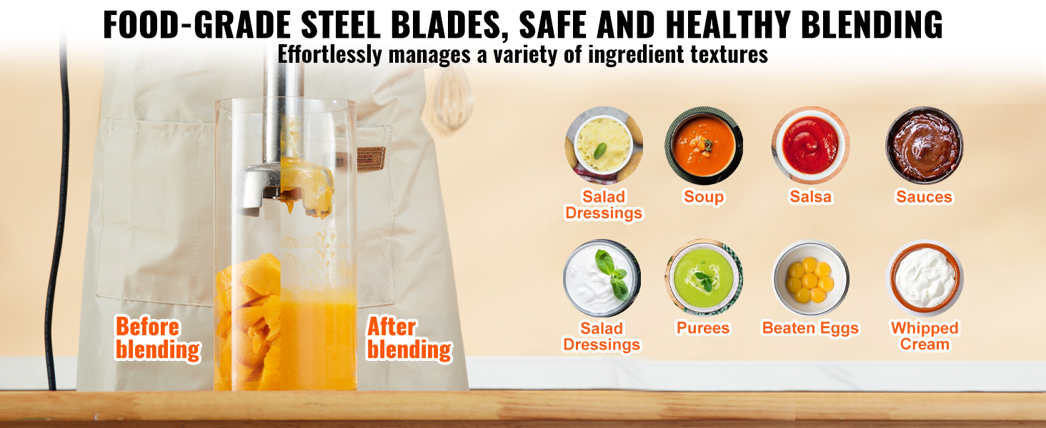 - Food-Grade Steel Blades: The sharp steel blades double the blending efficiency. Outfitted with food-grade 304 stainless steel blades, this electric stick blender assures safety in use. Quickly chop, grind, and unleash the nutrients of ingredients. Effortlessly craft delicious milkshakes, thick soups, and juices, ready to handle all kinds of ingredients.