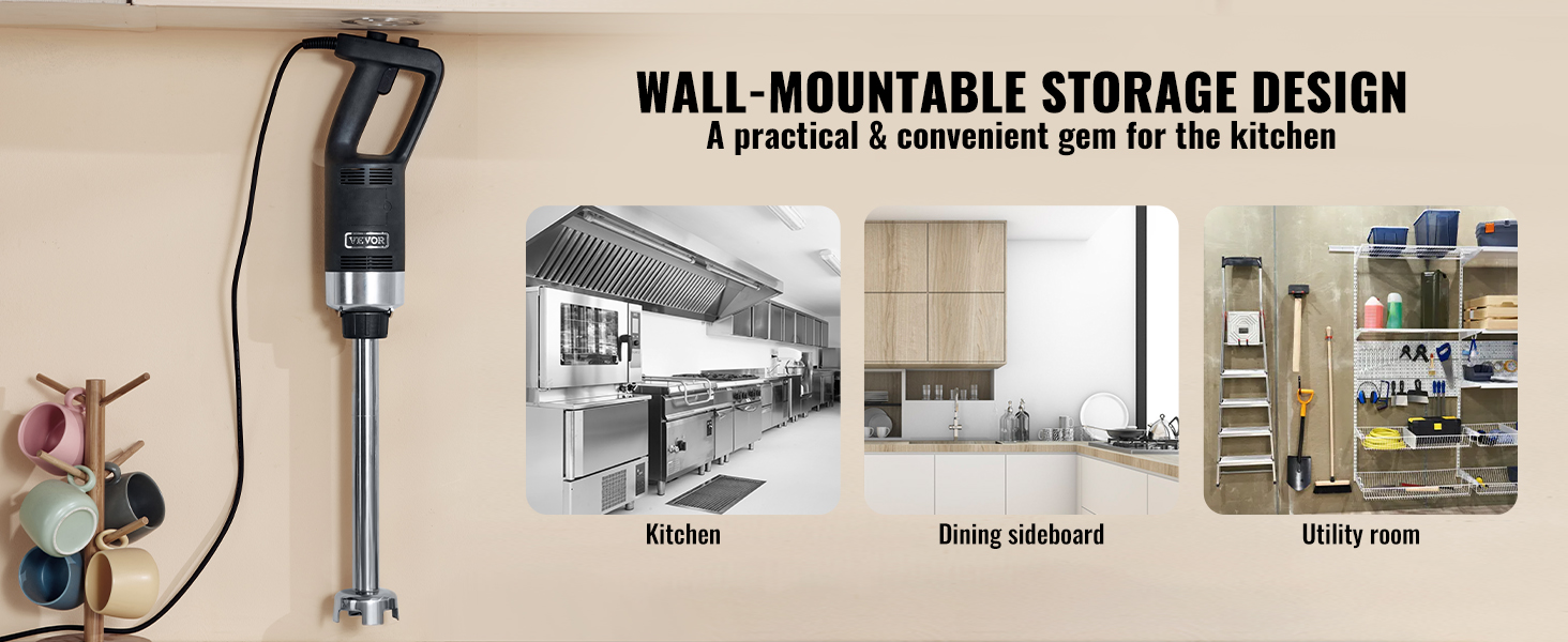 - User-Friendly Wall-mount Design: An innovative storage solution, specifically designed for wall-mounting. Depending on the setting, choose wall-mounted storage for easy accessibility. Elevated storage ensures better hygiene. It’s a practical and convenient gem for any kitchen, making it a must-have for those investing in a Commercial Immersion Blender.